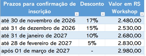 Investimento: R$2.980,00 por inscrito. Fazendo sua inscrição e iniciando o pagamento com antecedência você tem um bom desconto, veja na tabela abaixo e leia as informações adicionais importantes: